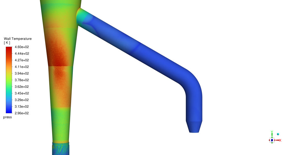 大型超临界锅炉体积庞大,在进行炉膛换热仿真时,复杂的水冷壁管束均进行简化,简化为平面,这种方法对气流的影响不大,但换热面积和热流密度与真实值不同。为提高仿真精度,我司采用一维仿真软件建立水冷壁内水管流动换热仿真模型,与三维CFD的平整壁面模型进行换热耦合,耦合过程中,根据能量守恒,修正热流密度,得到了准确的结果。修正后的模型两者热平衡率达到97.5%以上。