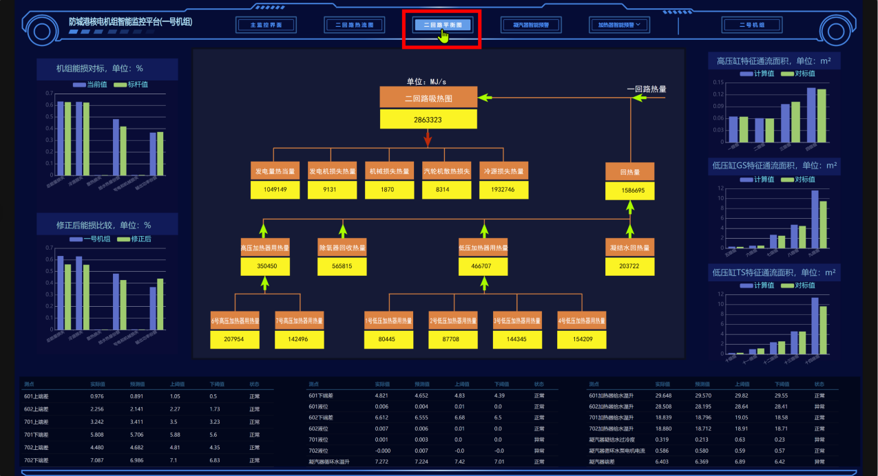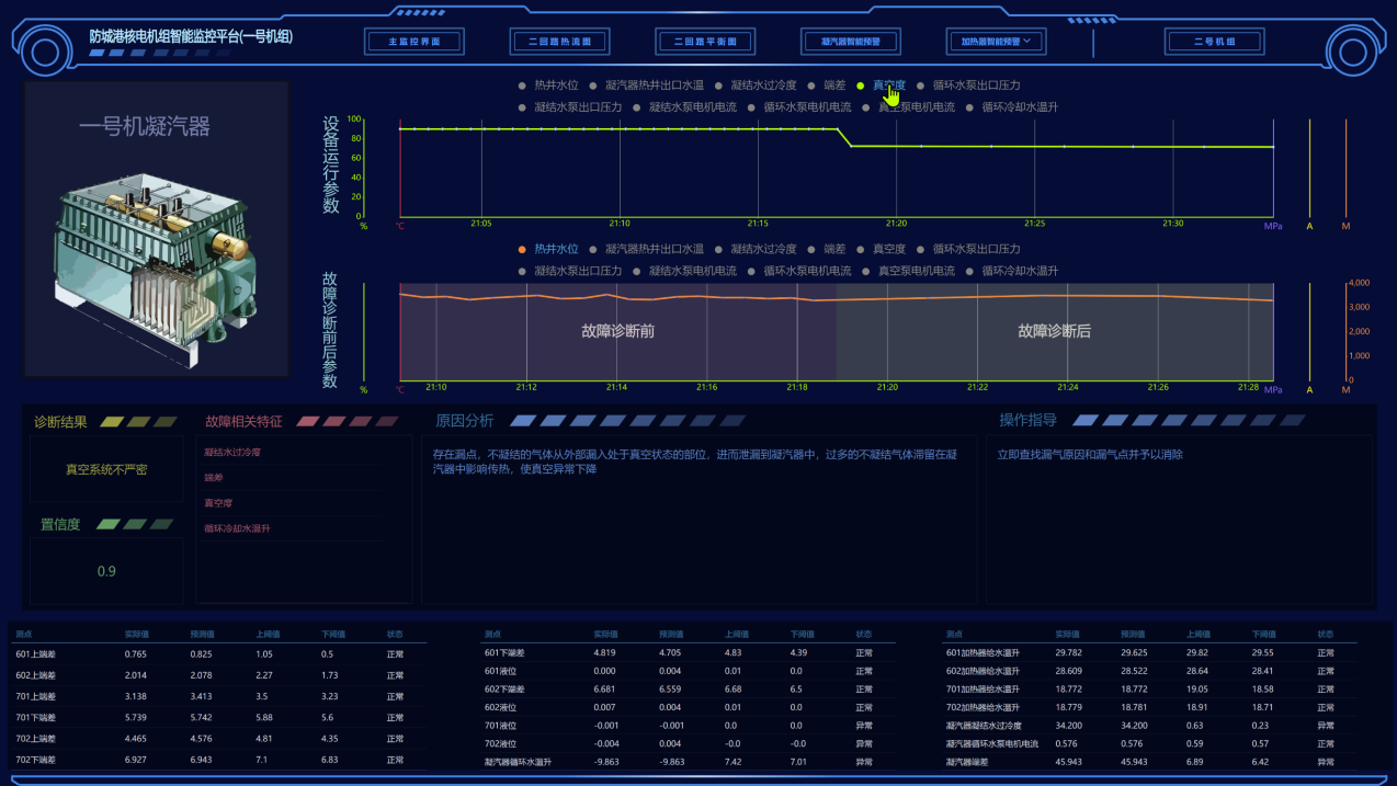 二回路的运行经济性是业主最关心的指标,同时,设备性能的衰退是电厂正常运行以及预防性维护的重要输入,而故障的精准诊断是对电厂的安全的重要保障。针对这些需求,我司开发了核电厂常规岛热力回路经济性与热力设备性能偏差智能预警与故障智能诊断程序。 程序以核电厂二回路100余个测点数据为输入,结合热工机理模型,可以计算出各设备和系统的经济性指标;借助多项AI模型,实现各主要设备的性能参数偏差预警;通过收集大量核电厂、火电厂的运行故障、仿真故障数据形成故障库,通过故障推理方法,可以精准给出设备故障的原因和操作指引。