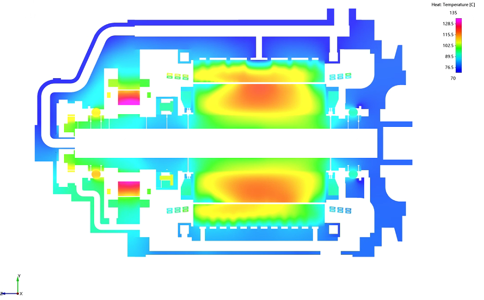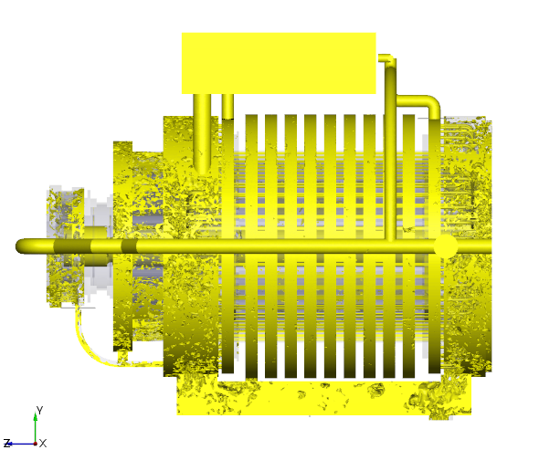 对于高能量密度的大功率电机,冷却技术尤为重要,通常定子线圈和转子均采用液冷技术,我司对某大功率高速油冷电机进行了建模和仿真。基于两相流仿真模型,并结合油液的流动换热和固体的导热进行共轭传热仿真,对电机的油量分配,保障整体冷却效果提供了重要支撑。